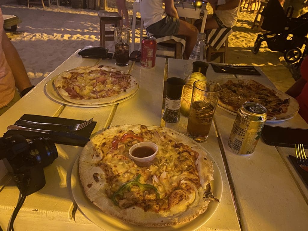 Rond half 7 konden we weer met de bus terug. We zijn gelijk doorgelopen om wat te eten. Lekker pizza op het strand.