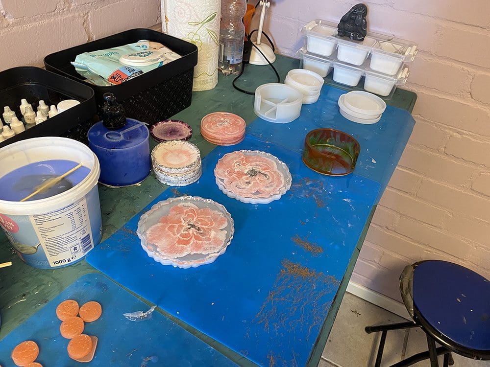 En daarna naar de onderzetters kijken en goten we twee Buddha beeldjes met epoxy.