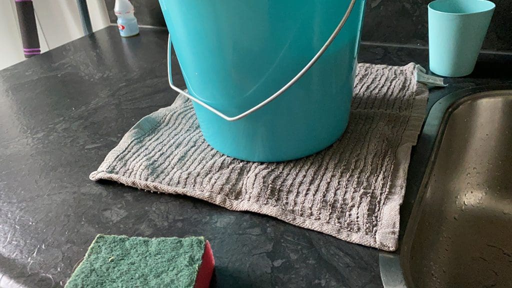 Nog even wat schoonmaken. Ik appte voor de grap al naar mijn moeder: ik volg het advies van Martien Meiland op. Netjes een doek onder je emmer om kringen te voorkomen, haha.