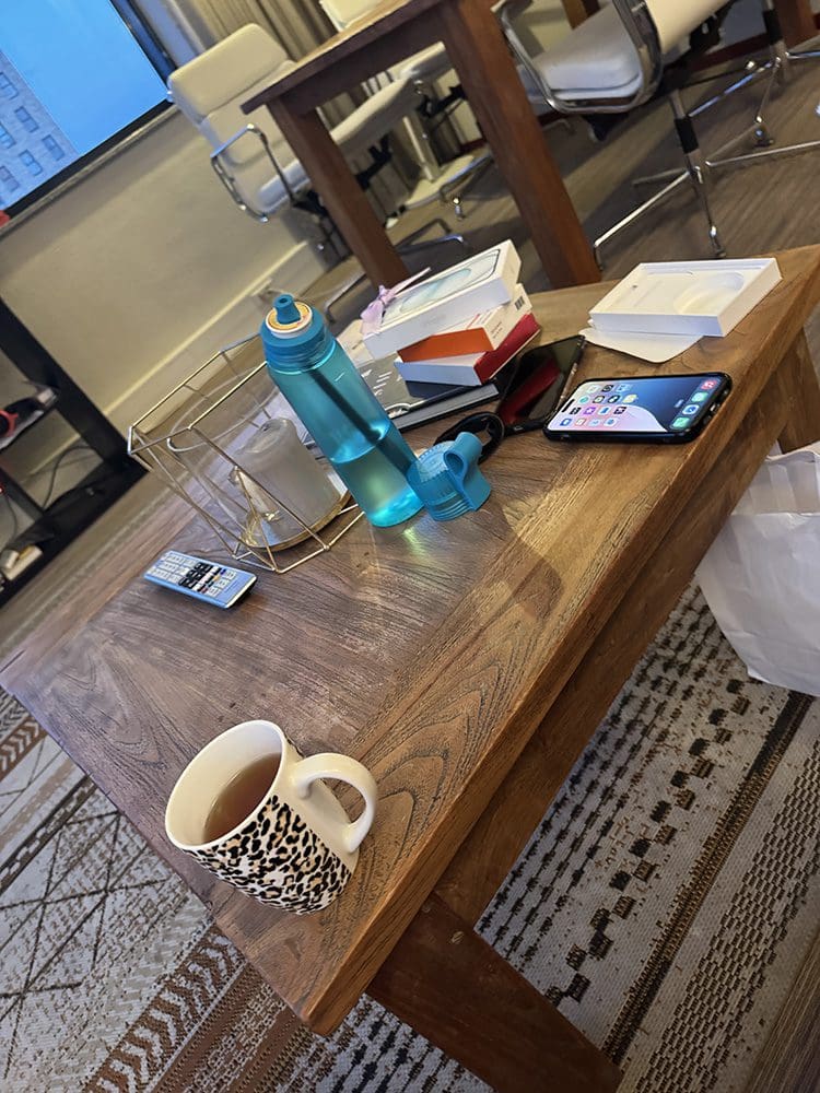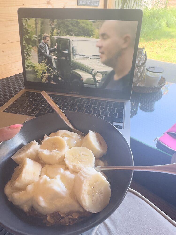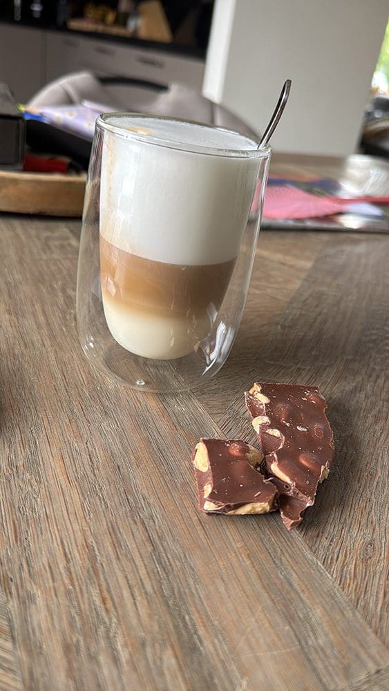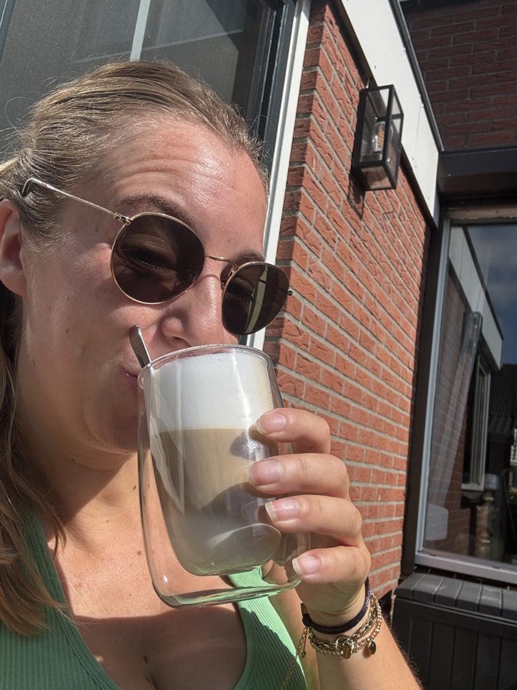 Dinsdag (24 juni). Lekker na het sporten koffie met wat lekkers. Ik was bezig achter de computer en mijn telefoon voor Instagram.