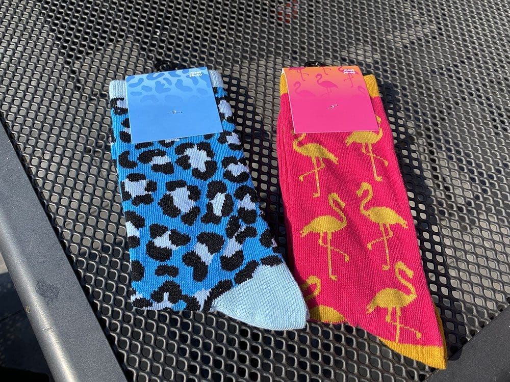Haha, deze gezellige sokken had ze van het Kruidvat. Ik de flamingo’s en moeders de panter.