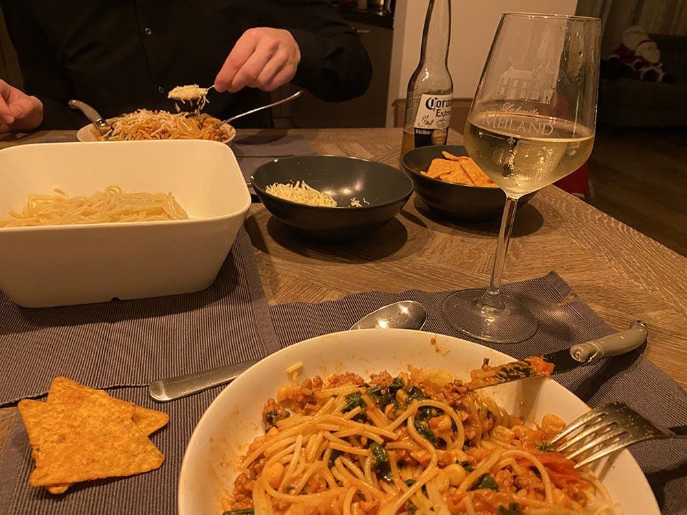 Eind van de middag kwam Floyd. In de jacuzzi bijkletsen en Thijs had daarna een lekkere pasta maaltijd gemaakt.
