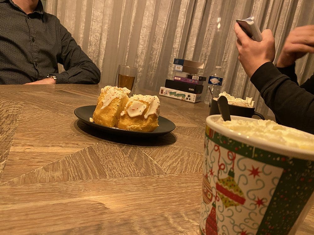De oliebollen kwamen op tafel. Proost!