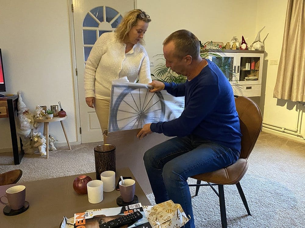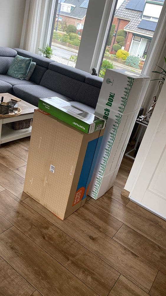 De pakketdienst kwam langs, haha. Alles werd in één keer bezorgd. We hebben in de sale alvast een kerstboom voor volgend jaar gescoord. Die pakketbezorger zei al: jeetje, deze is wel laat he. Ik zei: kijk eens naar binnen. We hebben al een boom, haha. We willen een grotere voor volgend jaar.