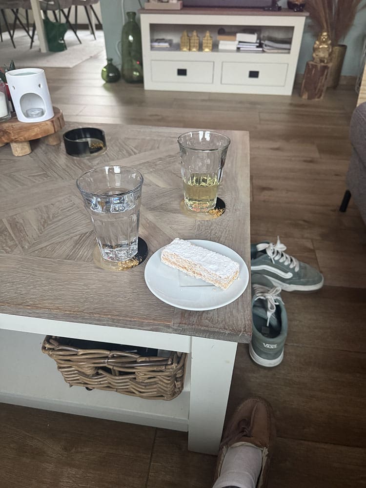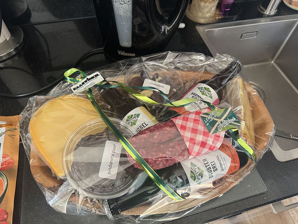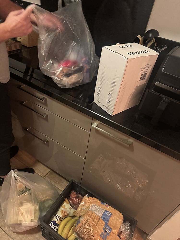 We moesten wel op de tijd letten want de boodschappen kwamen. Thijs had als verrassing zes flessen wijn besteld, haha. Dan heb je voorlopig genoeg zegt hij.