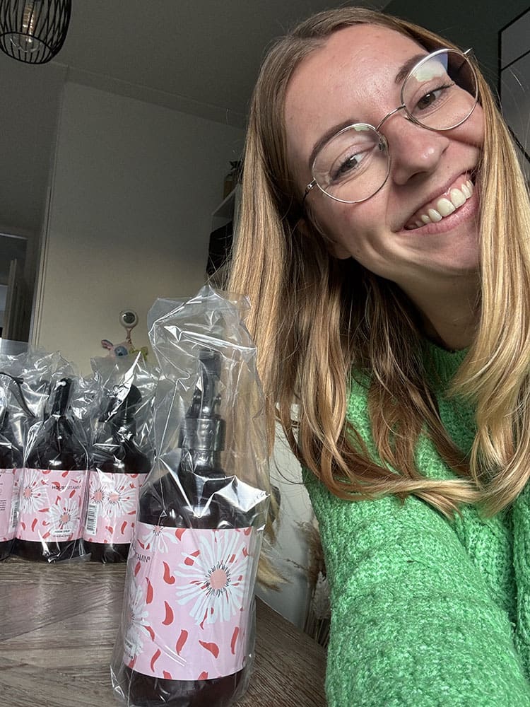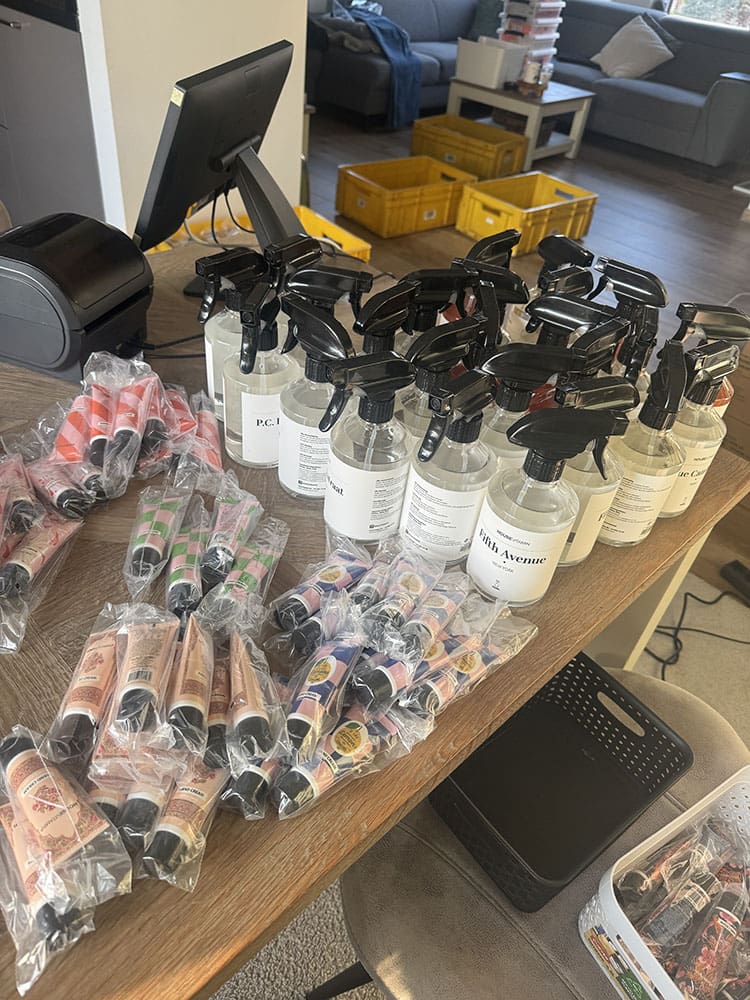 En door met de roomspray’s handzeep en handcreme’s.