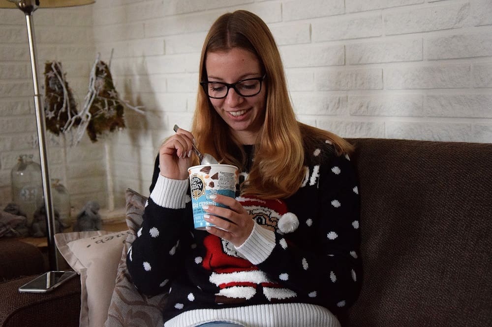 Met mijn kersttrui aan heerlijk op de bank chillen en genieten van Happy Mrs Jersey ijs! Dat is toch even een goed idee. Ik vind dat ijs helemaal niet alleen voor in de zomer is. Geef toe: we hebben altijd wel zin in ijs ;). En misschien een goede kersttip: na het heerlijke kerstdiner is dit een lekker toetje! Natuurlijk geef je niet iedereen een eigen bak, maar zet wat smaken neer en je kunt zelf opscheppen welke smaak je wilt. Jammie!