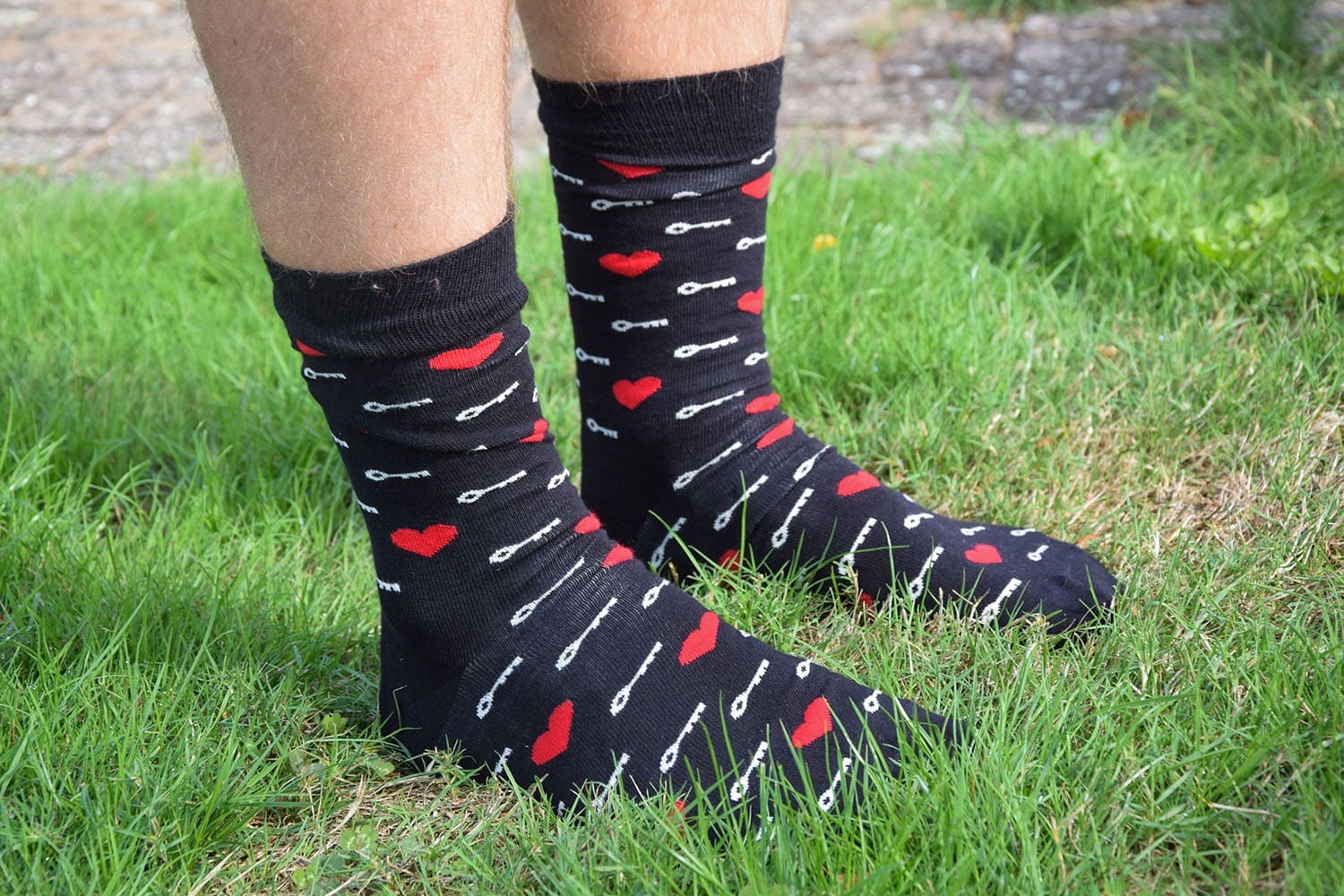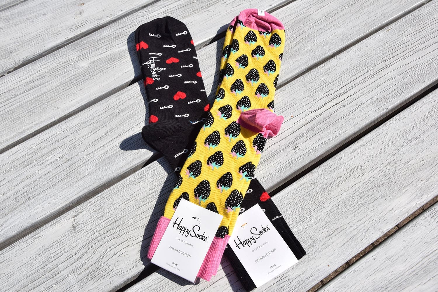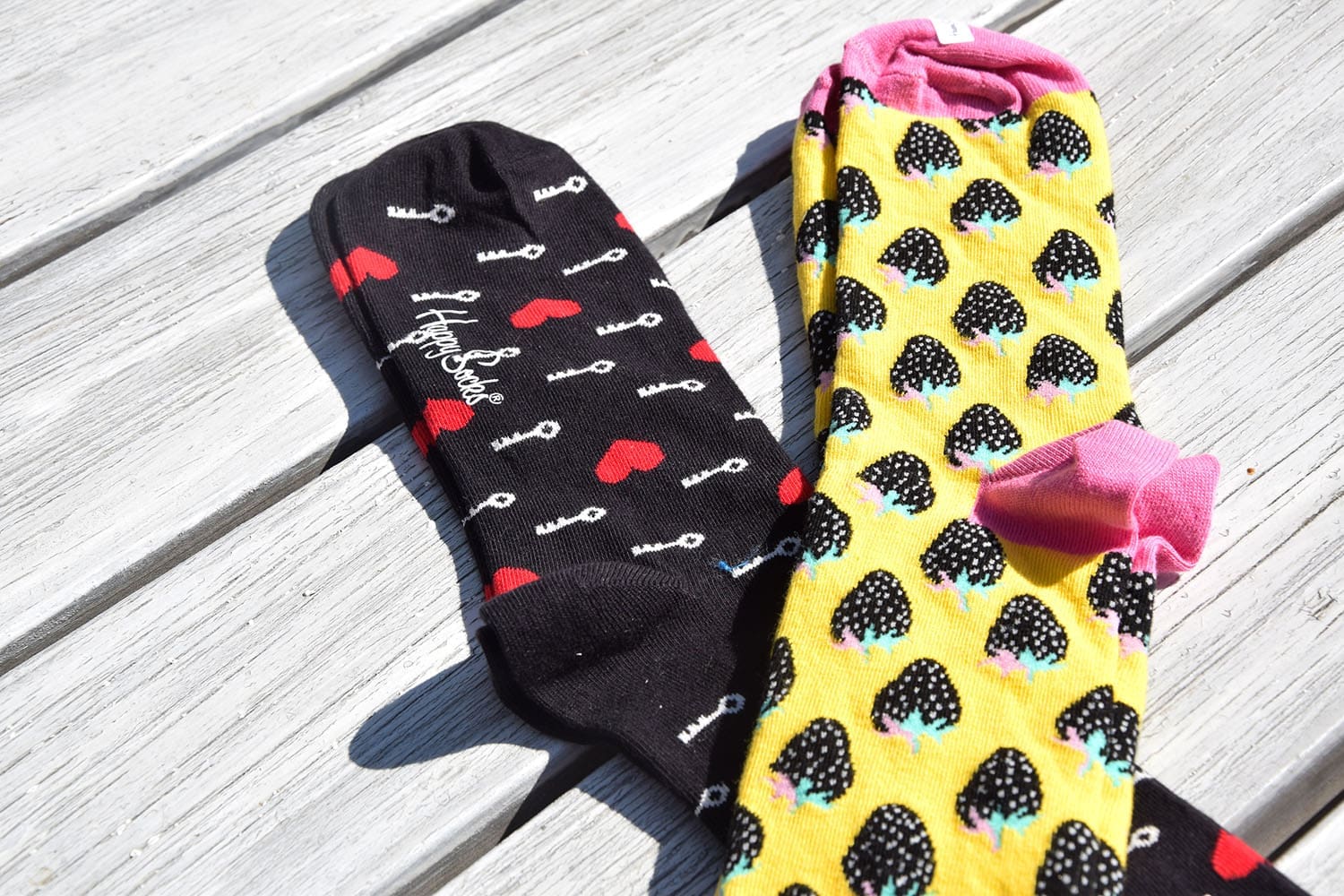 En dan de Happy Socks. Ik word hier serieus echt heel vrolijk van! Wat een feestje aan je voeten is dit, haha. Thijs moest er gelijk om lachen. We hebben gekozen voor een geel paar met een soort aardbeitjes erop en een zwart paar met hartjes en sleuteltjes. Dit deed mij denken aan de slotjesbrug in Parijs, waar Thijs en ik een slotje hebben opgehangen. De sokken voelen dik aan en zijn best lang. Maar volgens Thijs zitten ze lekker.